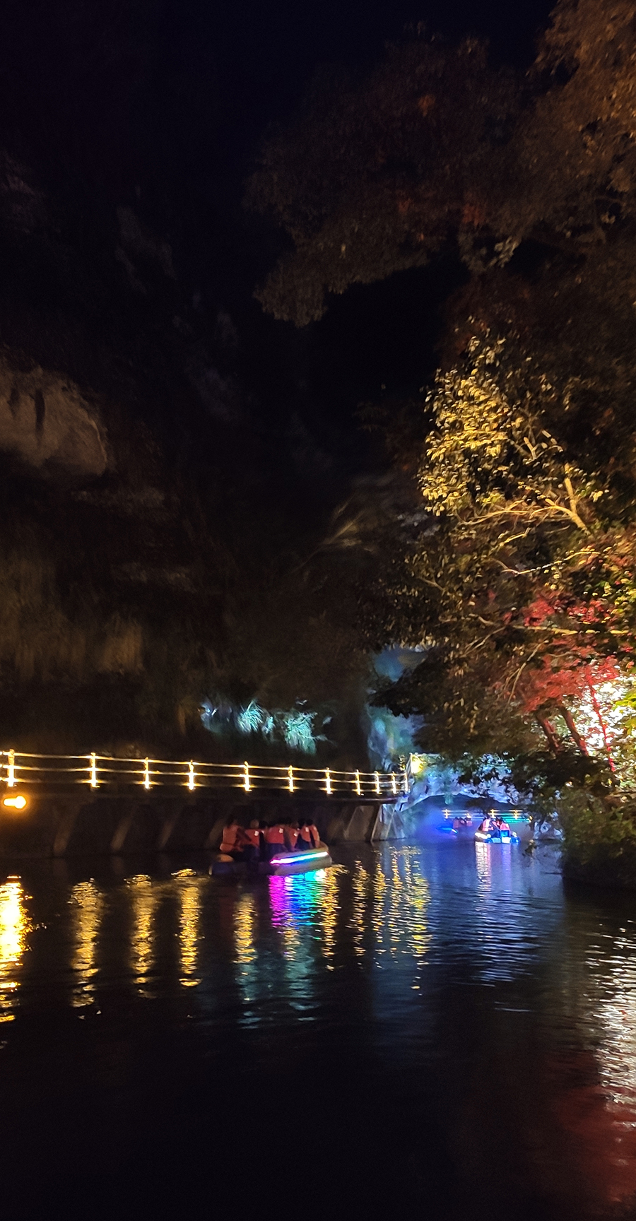 入夜,黨支部一行來到本次文旅最精彩的項目:“夜游九龍?zhí)?rdquo;。以“夜游九龍?zhí)叮o享夜的美”為主題的“行進式”水上峽谷夜游景區(qū),利用現(xiàn)代化聲光技術與景區(qū)自然美景有機融合,讓您充分感受“詩意山水,光影幻境”。聽蛙唱蟲奏,觀月下仙境,月光映水,水波映月,加上臨水棧道邊笛聲陣陣......讓您真切的領會空靈、幽靜、夢幻的別樣意境。一路的聲光風景讓人目不暇接,如果不是身臨其境,絕對感受不到那光影與大自然結合產(chǎn)生的絕妙意境。