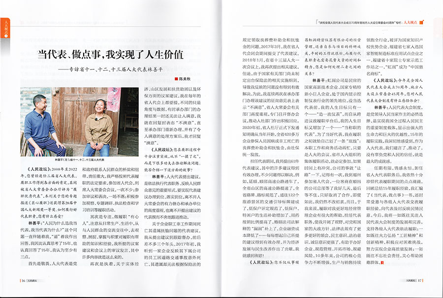 林善平:虹潤公司是民營的國家高新技術(shù)企業(yè)、國家專精特新小巨人企業(yè),處于國內(nèi)顯示控制儀表行業(yè)的領(lǐng)先地位。沒當(dāng)選代表前,我的人生目標(biāo)只有一個(gè)——“造一流儀表”,而自從跨進(jìn)議政履職平臺(tái)后,我的人生目標(biāo)又增加了一個(gè)——“當(dāng)稱職的代表”。為了當(dāng)好代表,我在履職之初就給自己劃了一條“底線”:本職工作和商務(wù)活動(dòng)再忙,只要是人大的會(huì)議、省市人大組織的集體履職活動(dòng),就必定參加。如果時(shí)間上有沖突,公司的事就“讓路”一下。記得有一次,我到福州參加省人代會(huì),一位客商在順昌的公司總部等了我好幾天,最后等不住,只好取消了合作。即便如此,我仍然不改初衷。而且,于我來說,履職對(duì)我更好地經(jīng)營管理企業(yè)有很大的幫助。擔(dān)任代表職務(wù),使我開闊了視野,對(duì)黨和國家的大政方針政策、法律法規(guī)有了更多更好的領(lǐng)會(huì),民主意識(shí)、法治意識(shí)、誠信意識(shí)更強(qiáng)了,有助于辦好企業(yè)、規(guī)范管理、開拓市場(chǎng)、規(guī)避風(fēng)險(xiǎn)。10多年來,公司的核心競(jìng)爭力不斷增強(qiáng),生產(chǎn)與銷售持續(xù)領(lǐng)跑全行業(yè),被評(píng)為國家知識(shí)產(chǎn)權(quán)優(yōu)勢(shì)企業(yè)、福建省七家入選國家智能制造標(biāo)準(zhǔn)應(yīng)用試點(diǎn)企業(yè)之一、福建省十家院士專家示范工作站之一,“虹潤”成為“中國馳名商標(biāo)”。