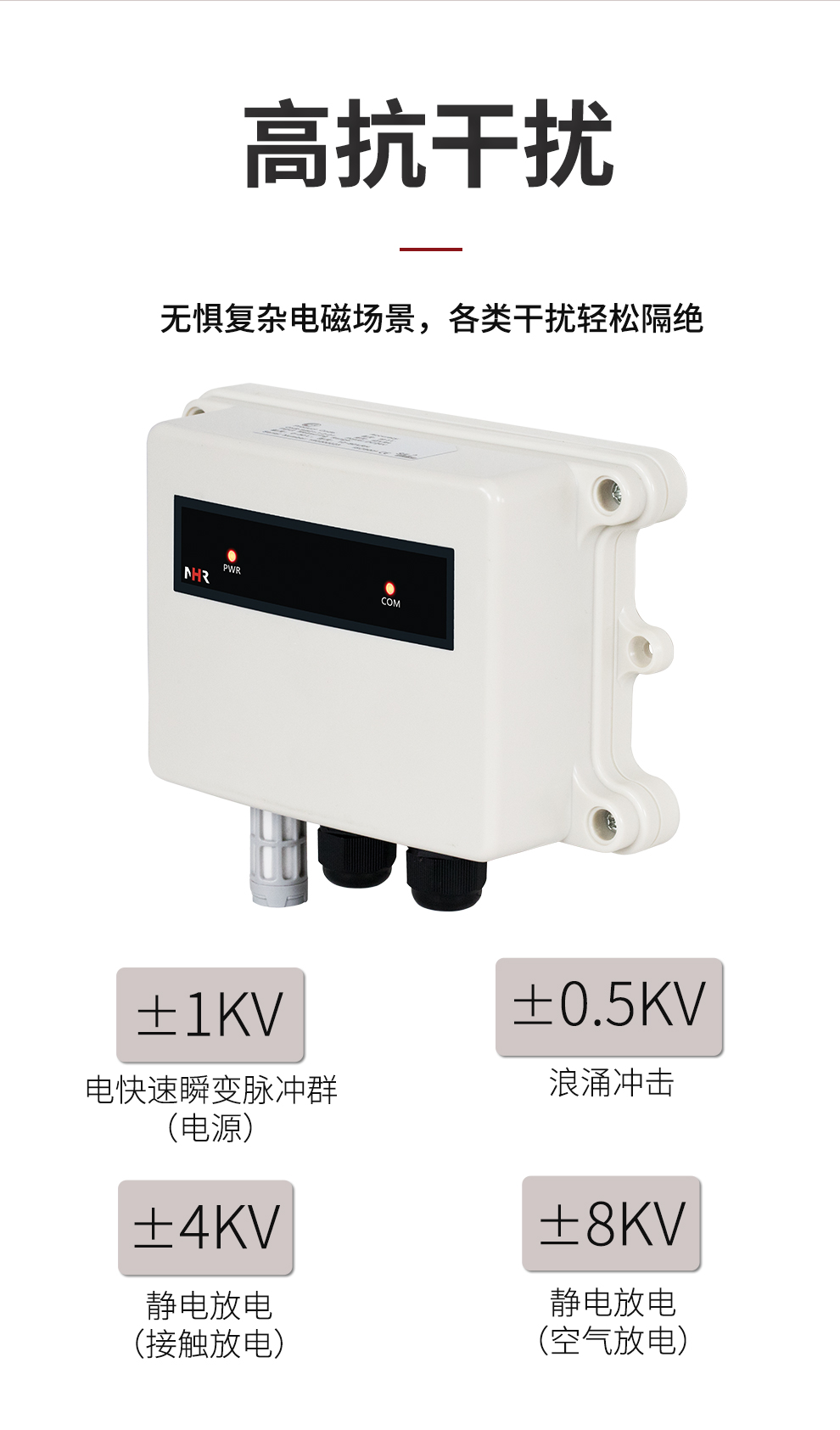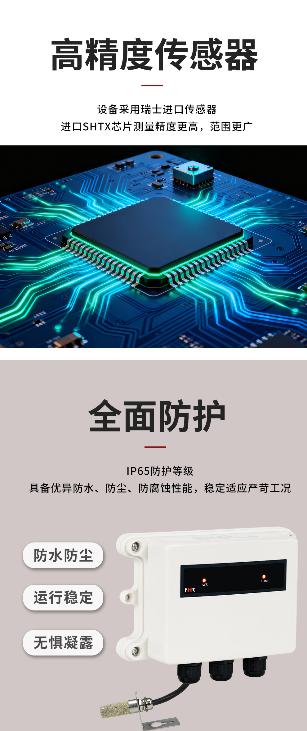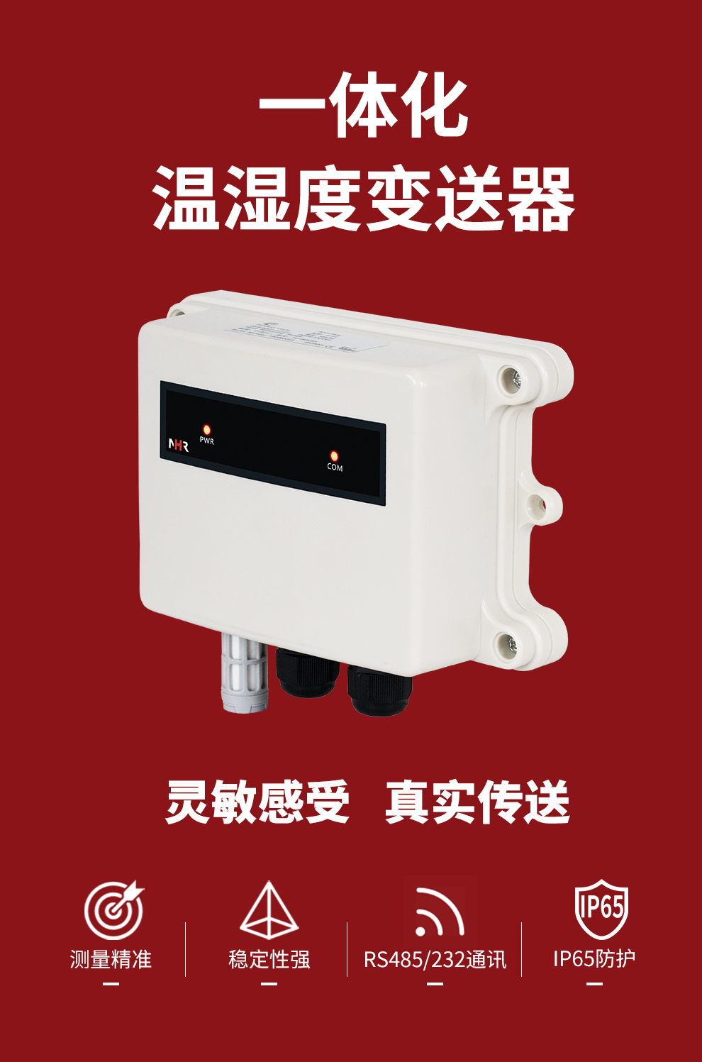 虹潤公司是專業(yè)生產(chǎn)環(huán)境監(jiān)測儀表的國家專精特新“小巨人”企業(yè)。生產(chǎn)的一體式溫濕度變送器,具有溫度、濕度、露點高精準的測量與變送,報警繼電器輸出,RS485/RS232通訊,IP65防護等級等特點。產(chǎn)品獲得一種手持式低功耗溫濕度檢測儀、大屏幕溫濕度記錄儀等2項國家發(fā)明專利,主持起草物聯(lián)網(wǎng)智能溫度儀表通用技術條件、冷鏈溫度記錄儀等2項國家標準,以及通信系統(tǒng)多通道數(shù)據(jù)采集控制終端規(guī)范軍用標準,以及現(xiàn)場設備集成等5項智能制造國家標準,參與國際5G標準制定,取得溫濕度儀表等3項相關軟件著作權。產(chǎn)品廣泛應用于工業(yè)現(xiàn)場、農(nóng)業(yè)大棚、倉儲物流、地下管廊、養(yǎng)殖孵化、配電機房等諸多領域。