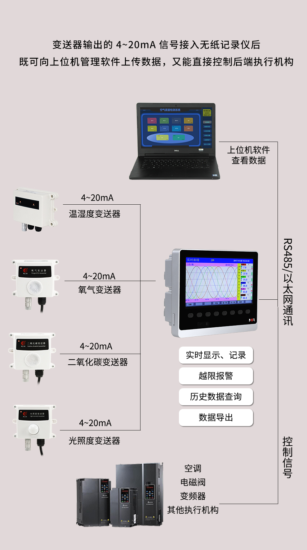| 環(huán)境監(jiān)測儀 | 大屏溫濕度記錄儀 溫濕度儀表 環(huán)境參數(shù)變送器 直插式土壤傳感器 |