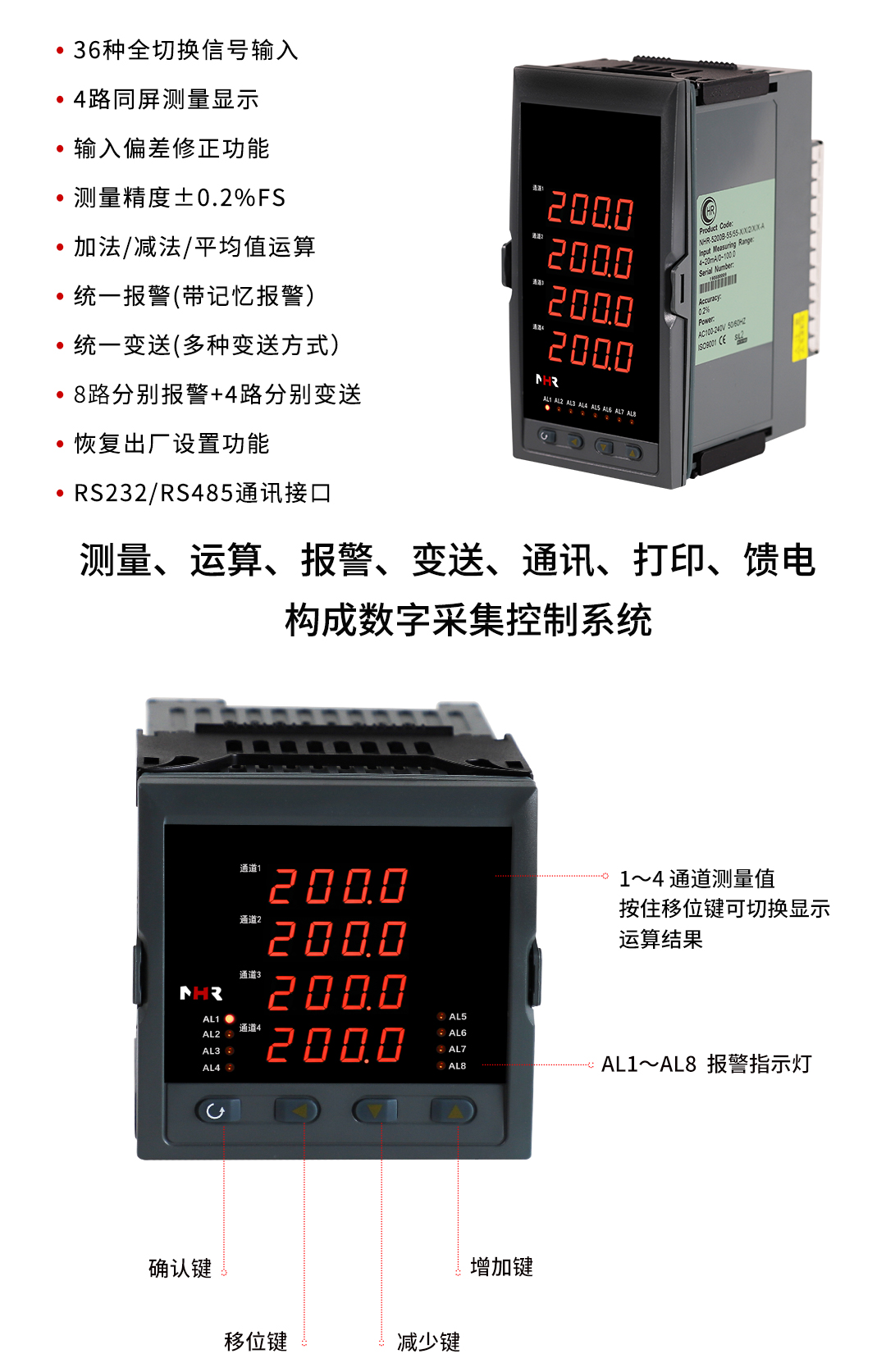 NHR-5740系列四回路測量顯示控制儀針對現(xiàn)場溫度、壓力、液位、速度等各種信號進行采集、顯示、控制、遠傳、通訊、 打印等處理,構(gòu)成數(shù)字采集系統(tǒng)及控制系統(tǒng)。