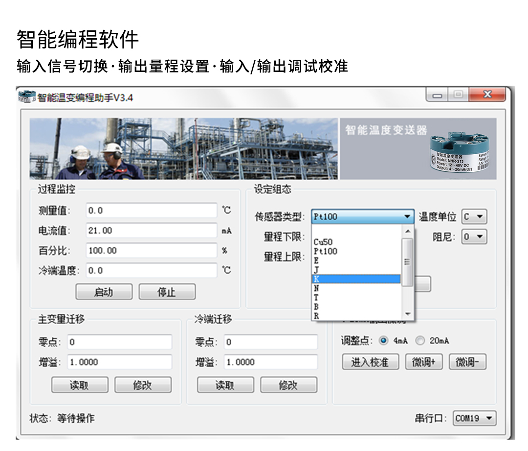 回路供電溫度變送器分為M213智能溫度變送器、M214隔離智能溫度變送器、M215 HART智能溫度變送器,變送器將現(xiàn)場的熱電阻或熱電偶信號經(jīng)過隔離放大處理,轉(zhuǎn)換為與溫度成線性的二線制4-20mA(HART)信號輸出至控制系統(tǒng)。