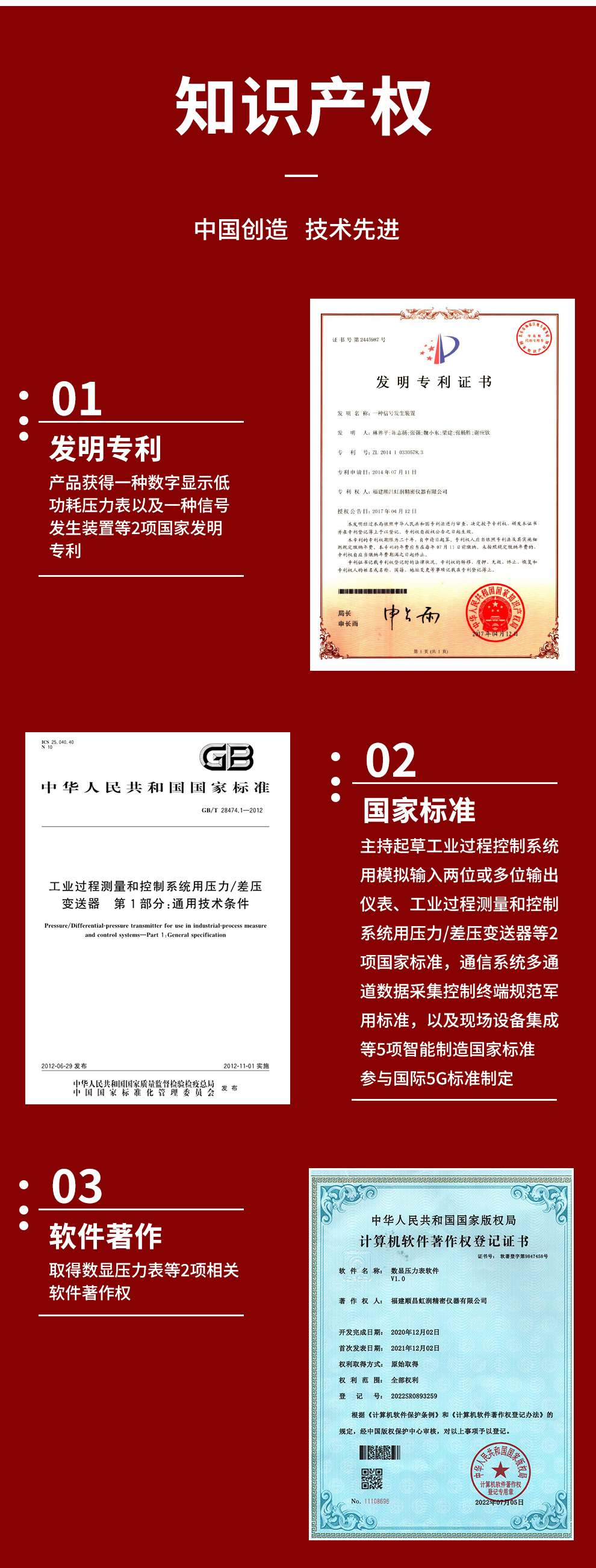 虹潤公司是專業(yè)生產數(shù)顯壓力表的國家專精特新“小巨人”企業(yè)。生產的智能數(shù)字壓力表,具有氣體液體通用,測量精度高,自動溫度補償,響應速度快,電池供電低功耗漂移小等特點。產品獲得一種數(shù)字顯示低功耗壓力表以及一種信號發(fā)生裝置等2項國家發(fā)明專利,主持起草工業(yè)過程控制系統(tǒng)用模擬輸入兩位或多位輸出儀表、工業(yè)過程測量和控制系統(tǒng)用壓力/差壓變送器等2項國家標準,通信系統(tǒng)多通道數(shù)據(jù)采集控制終端規(guī)范軍用標準,以及現(xiàn)場設備集成等5項智能制造國家標準,參與國際5G標準制定,取得數(shù)顯壓力表等2項相關軟件著作權。產品廣泛石化、冶金、電力、制藥、食品、航空航天、工業(yè)循環(huán)水系統(tǒng)等諸多領域。