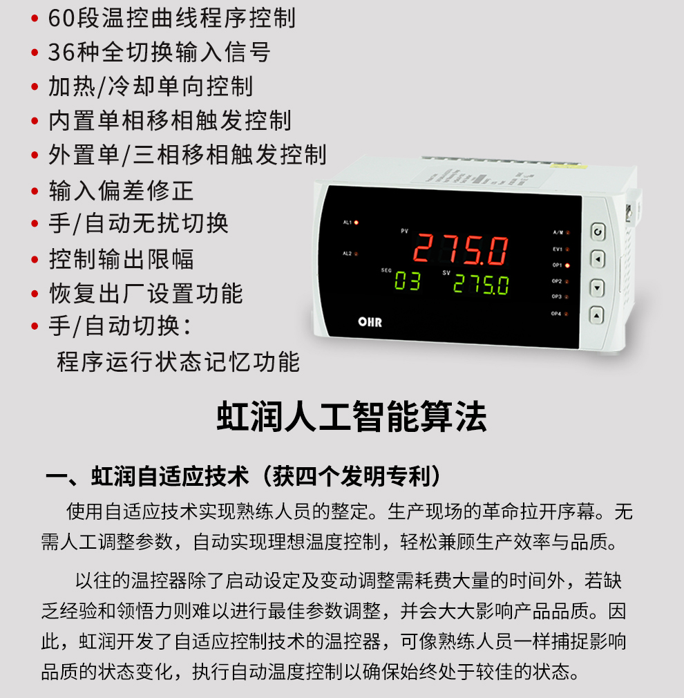 OHR-E400系列60段人工智能溫控器采用真正的人工智能算式,儀表啟動(dòng)自整定功能,可以根據(jù)被控對(duì)象的特性,自動(dòng)尋找參數(shù)以達(dá)到很好的控制效果,無(wú)需人工整定參數(shù)。控溫精度基本達(dá)±0.1℃,無(wú)超調(diào)、欠調(diào),達(dá)國(guó)際先進(jìn)水平。