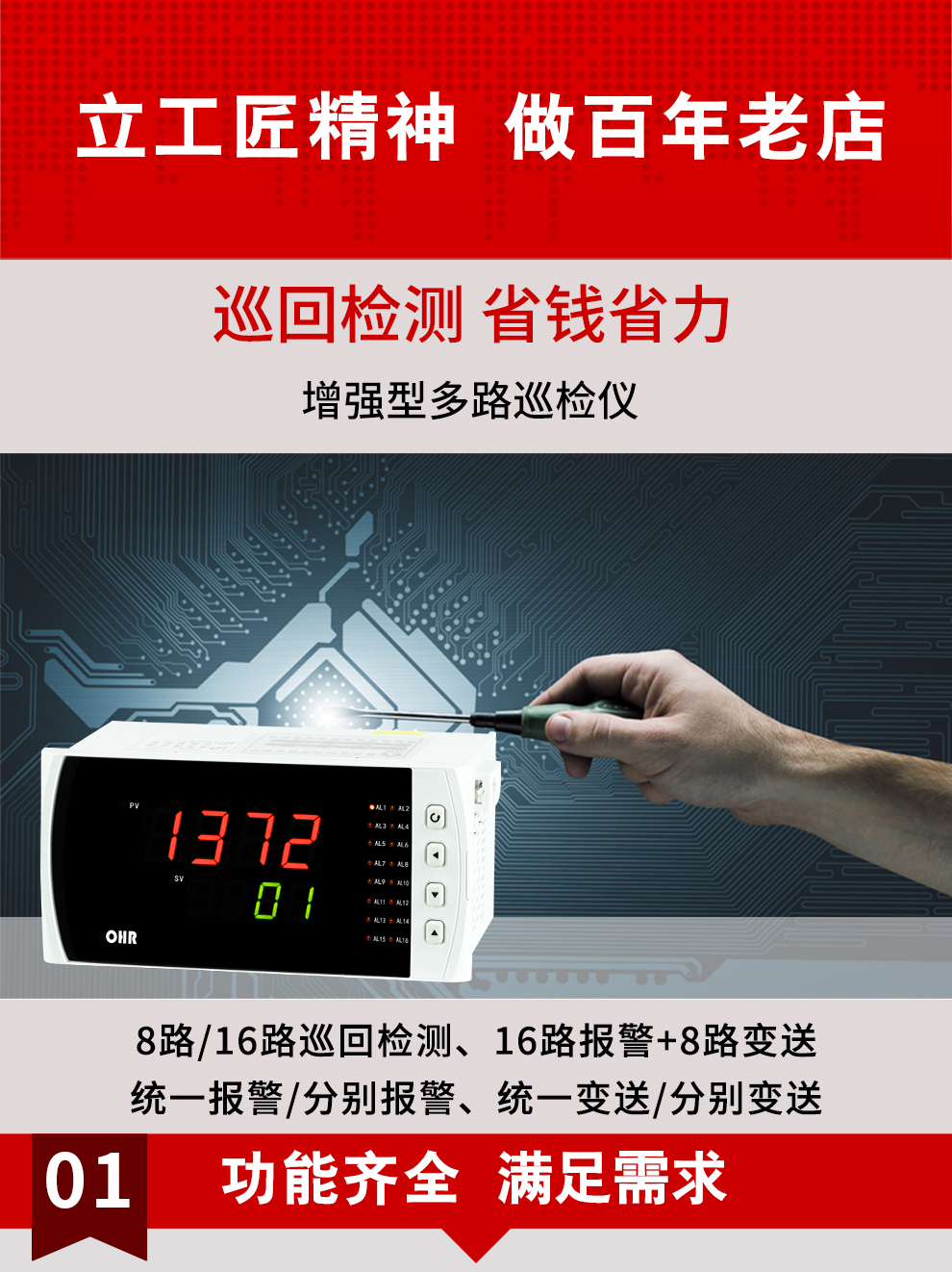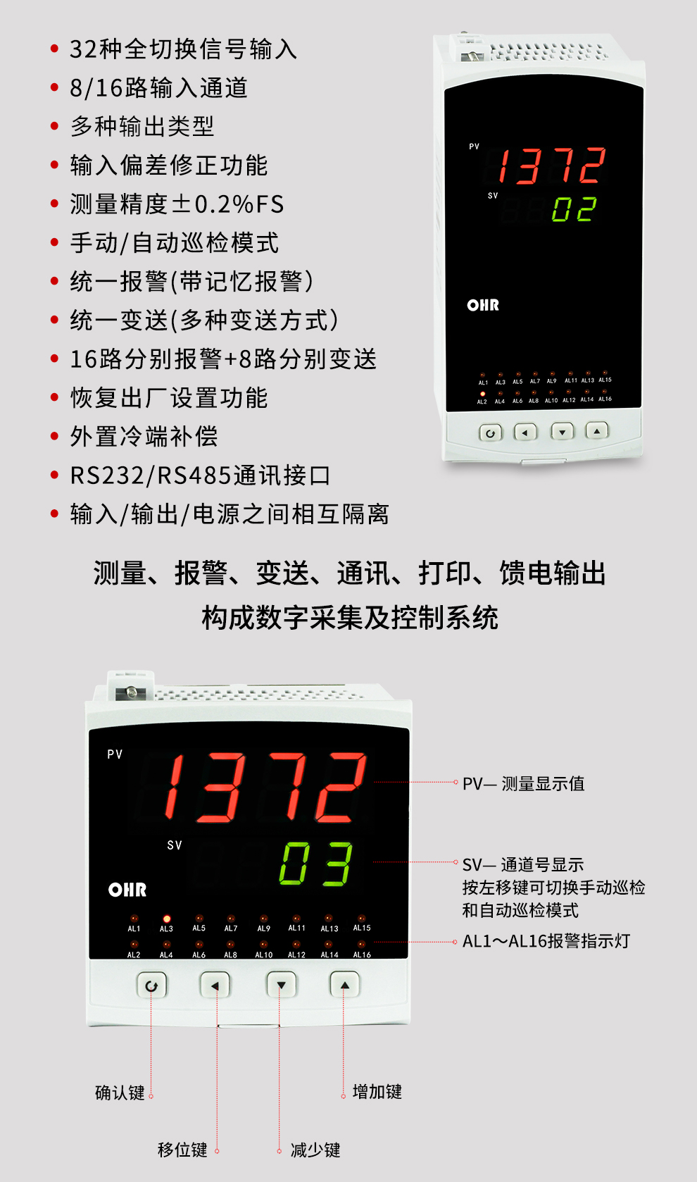 OHR-E702系列增強型多回路測量顯示控制儀針對現(xiàn)場溫度、壓力、液位、速度等各種信號進行采集、顯示、控制、遠(yuǎn)傳、通訊、 打印等處理,構(gòu)成數(shù)字采集系統(tǒng)及控制系統(tǒng),適用于需要進行多測量點巡回檢測的系統(tǒng)。
