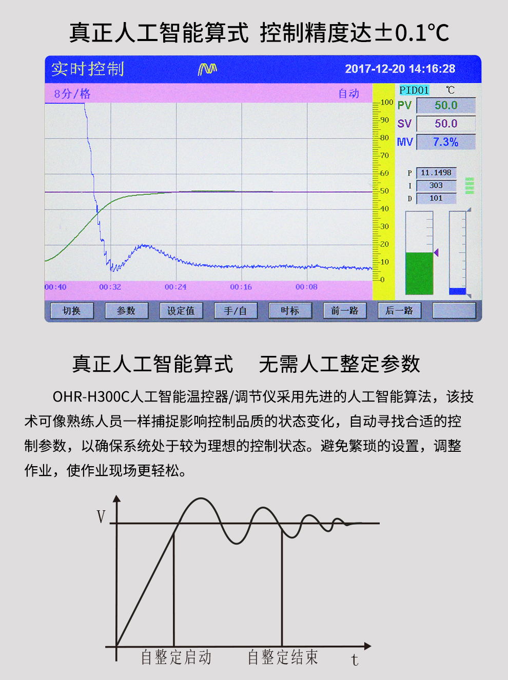 OHR-H300C系列觸摸式溫控器采用真正的人工智能算式,儀表啟動自整定功能,可以根據(jù)被控對象的特性,自動尋找最優(yōu)參數(shù)以達(dá)到很好的控制效果,無需人工整定參數(shù)??販鼐然具_(dá)±0.1℃,無超調(diào)、欠調(diào),達(dá)國際先進(jìn)水平。24路萬能輸入(可組態(tài)選擇輸入:標(biāo)準(zhǔn)電壓、標(biāo)準(zhǔn)電流、熱電偶、熱電阻、毫伏等)其中可帶8路控制輸入。