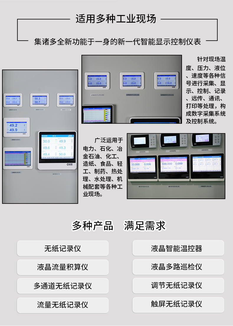 OHR-T系列觸摸超薄調(diào)節(jié)無紙記錄儀采用真正的人工智能算式,儀表啟動自整定 功能,可以根據(jù)被控對象的特性,自動尋找最優(yōu)參數(shù)以達(dá)到很好的控制效果,無需人工整 定參數(shù)??販鼐然具_(dá)±0.1℃,無超調(diào)、欠調(diào),達(dá)國際先進(jìn)水平。4路萬能信號輸入 (可組態(tài)選擇輸入:標(biāo)準(zhǔn)電壓、標(biāo)準(zhǔn)電流、熱電偶、熱電阻、頻率、毫伏等)。