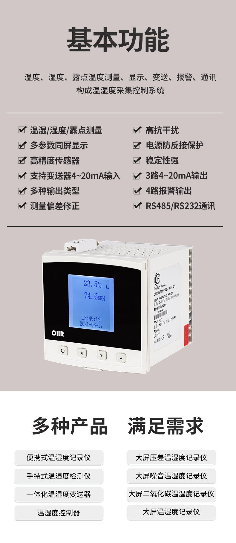 虹潤公司是專業(yè)生產(chǎn)環(huán)境監(jiān)測(cè)儀表的國家專精特新“小巨人”企業(yè)。生產(chǎn)的壁掛式溫濕度控制器,具有溫度、濕度、露點(diǎn)高精準(zhǔn)的測(cè)量,多種輸出類型,穩(wěn)定性強(qiáng),RS485/RS232通訊,IP65防護(hù)等級(jí)等特點(diǎn)。產(chǎn)品獲得一種手持式低功耗溫濕度檢測(cè)儀、大屏幕溫濕度記錄儀等2項(xiàng)國家發(fā)明專利,主持起草物聯(lián)網(wǎng)智能溫度儀表通用技術(shù)條件、冷鏈溫度記錄儀等2項(xiàng)國家標(biāo)準(zhǔn),通信系統(tǒng)多通道數(shù)據(jù)采集控制終端規(guī)范軍用標(biāo)準(zhǔn),以及現(xiàn)場(chǎng)設(shè)備集成等5項(xiàng)智能制造國家標(biāo)準(zhǔn),參與國際5G標(biāo)準(zhǔn)制定,取得溫濕度儀表等2項(xiàng)相關(guān)軟件著作權(quán)。產(chǎn)品廣泛應(yīng)用于工業(yè)現(xiàn)場(chǎng)、農(nóng)業(yè)大棚、倉儲(chǔ)物流、地下管廊、養(yǎng)殖孵化、配電機(jī)房等諸多領(lǐng)域。