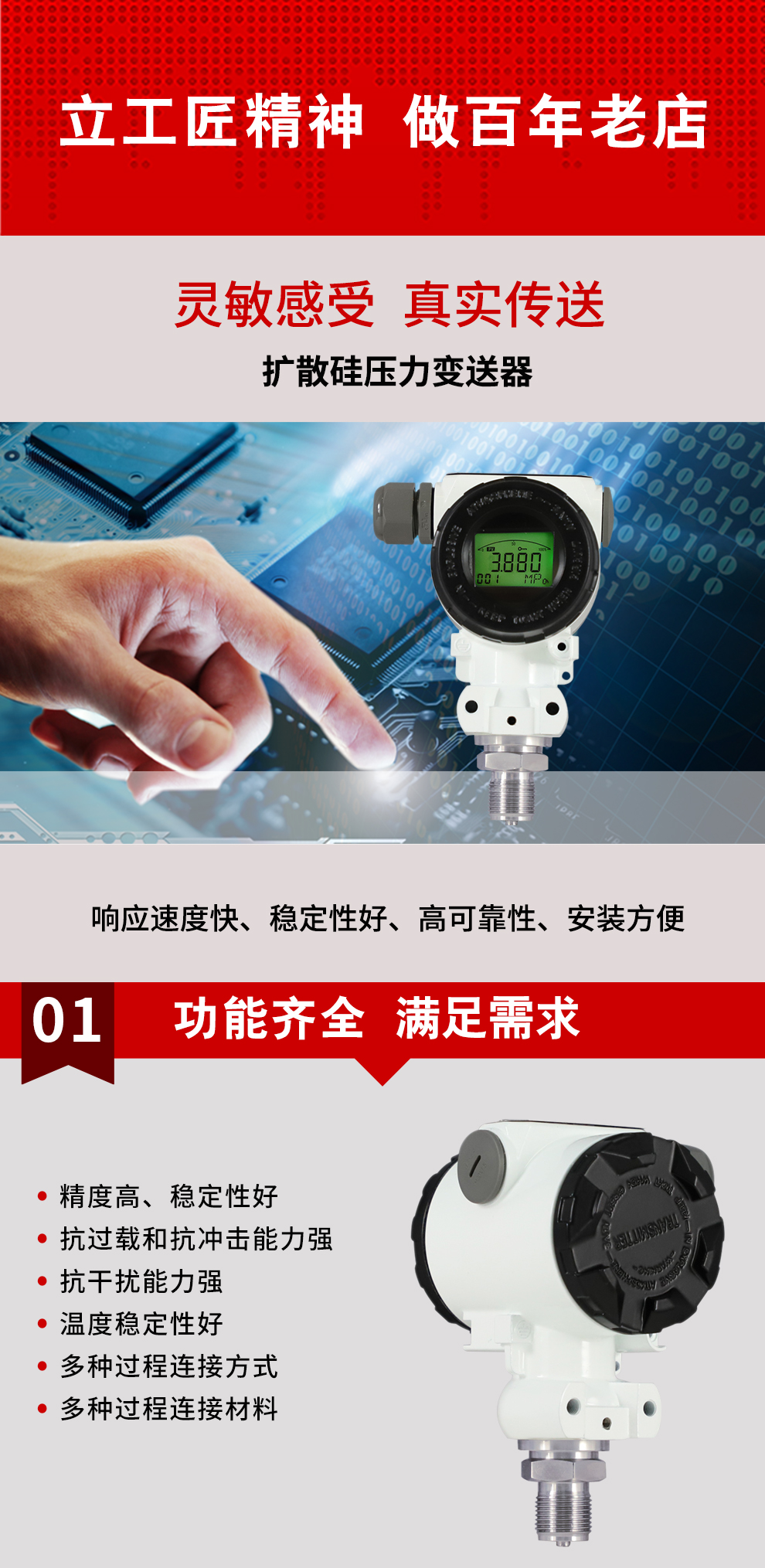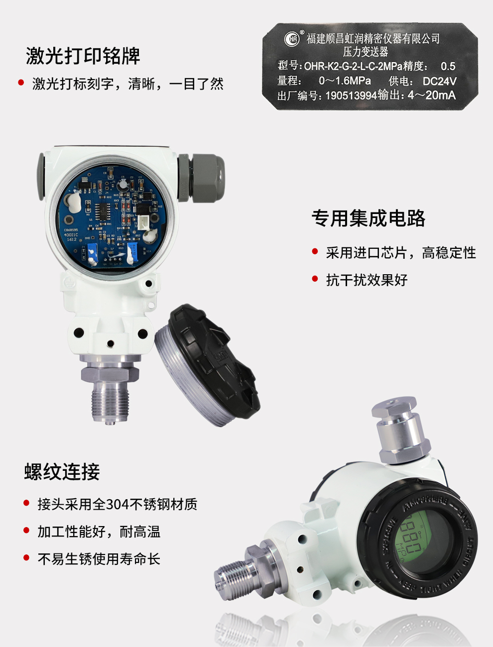 虹潤(rùn)公司是專業(yè)生產(chǎn)壓力變送器的國(guó)家專精特新“小巨人”企業(yè),生產(chǎn)的擴(kuò)散硅壓力變送器,具有精度高,穩(wěn)定性好,響應(yīng)速度快,高可靠性,抗過(guò)載和抗沖擊能力強(qiáng),安裝方便等特點(diǎn)。產(chǎn)品獲得一種數(shù)字顯示低功耗壓力表、一種信號(hào)發(fā)生器裝置等2項(xiàng)國(guó)家發(fā)明專利,主持起草工業(yè)過(guò)程控制系統(tǒng)用模擬輸入兩位或多位輸出儀表、工業(yè)過(guò)程測(cè)量和控制系統(tǒng)用壓力/差壓變送器等2項(xiàng)國(guó)家標(biāo)準(zhǔn),通信系統(tǒng)多通道數(shù)據(jù)采集控制終端規(guī)范軍用標(biāo)準(zhǔn),以及現(xiàn)場(chǎng)設(shè)備集成等5項(xiàng)智能制造國(guó)家標(biāo)準(zhǔn)。參與國(guó)際5G標(biāo)準(zhǔn)制定,取得數(shù)顯壓力表等2項(xiàng)相關(guān)軟件著作權(quán)。產(chǎn)品廣泛應(yīng)用于化工、食品、制藥、電力、設(shè)備配套、供暖、水處理、樓宇等行業(yè),需精準(zhǔn)測(cè)量流體壓力的現(xiàn)場(chǎng)。