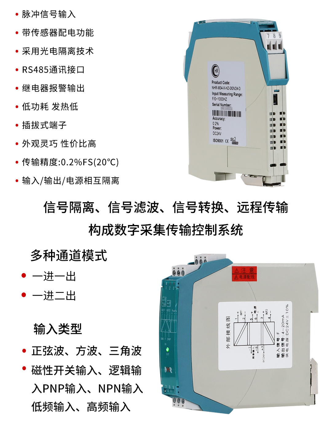 NHR-M34系列智能頻率轉換器將頻率信號經(jīng)隔離整形放大后,變送隔離輸出所需的信號,也可向現(xiàn)場的一次儀表提供電源回路。