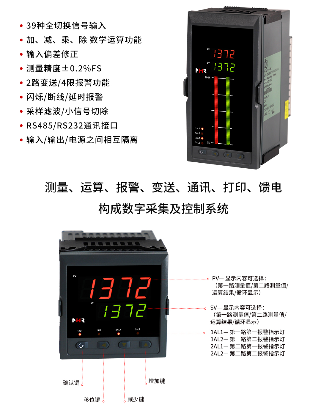 NHR-5200系列雙回路數(shù)字顯示控制儀針對現(xiàn)場溫度、壓力、液位、速度等各種信號進行采集、顯示、控制、遠傳、通訊、打印等處理,構成數(shù)字采集系統(tǒng)及控制系統(tǒng),廣泛運用于電力、石化、冶金、輕工、制藥、航空等諸多領域。