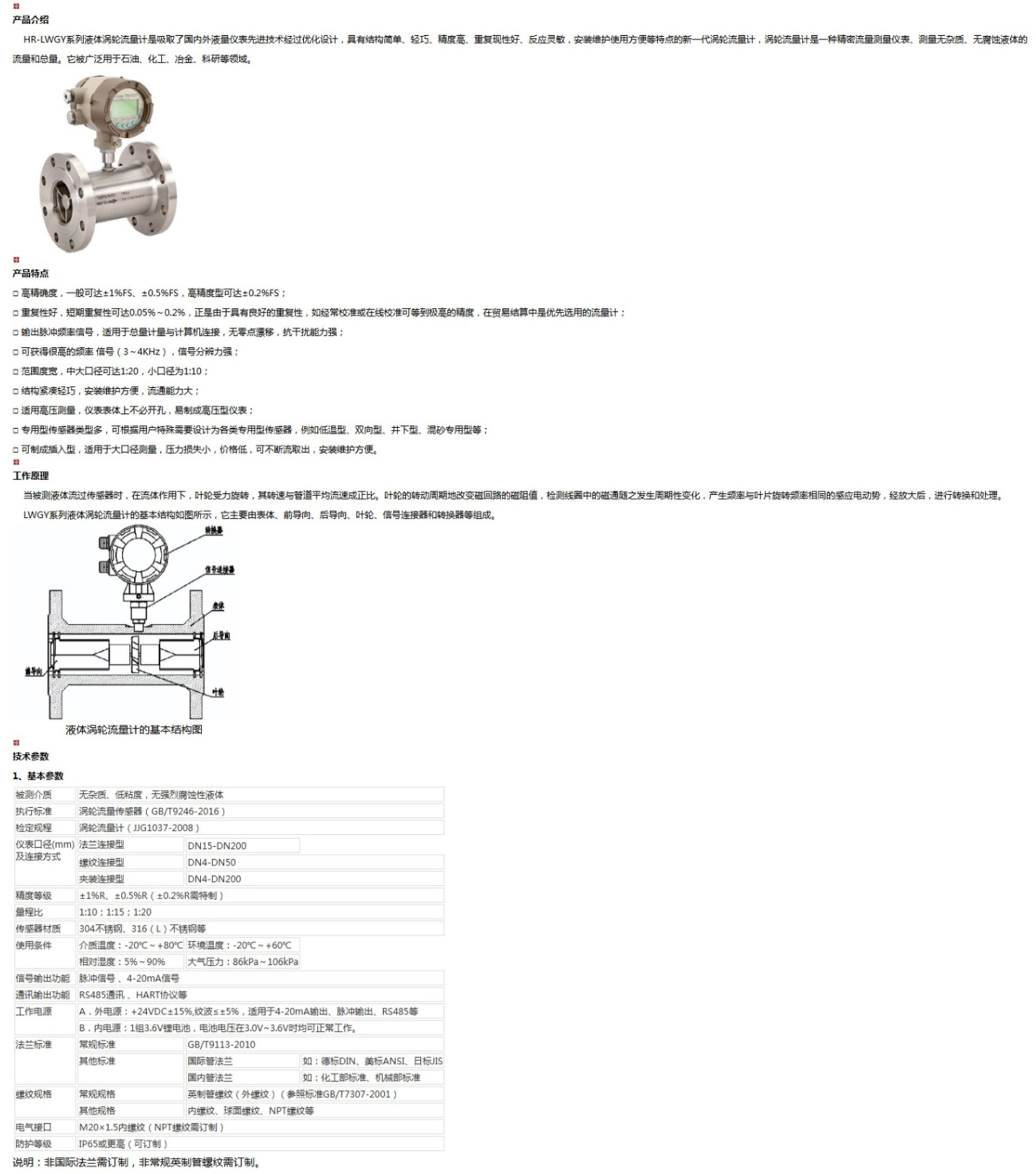 HR-LWGY系列液體渦輪流量計(jì)是吸取了國內(nèi)外液量?jī)x表先進(jìn)技術(shù)經(jīng)過優(yōu)化設(shè)計(jì),具有結(jié)構(gòu)簡(jiǎn)單、輕巧、精度高、重復(fù)現(xiàn)性好、反應(yīng)靈敏,安裝維護(hù)使用方便等特點(diǎn)的新一代渦輪流量計(jì),渦輪流量計(jì)是一種精密流量測(cè)量?jī)x表、測(cè)量無雜質(zhì)、無腐蝕液體的流量和總量。它被廣泛用于石油、化工、冶金、科研等領(lǐng)域。